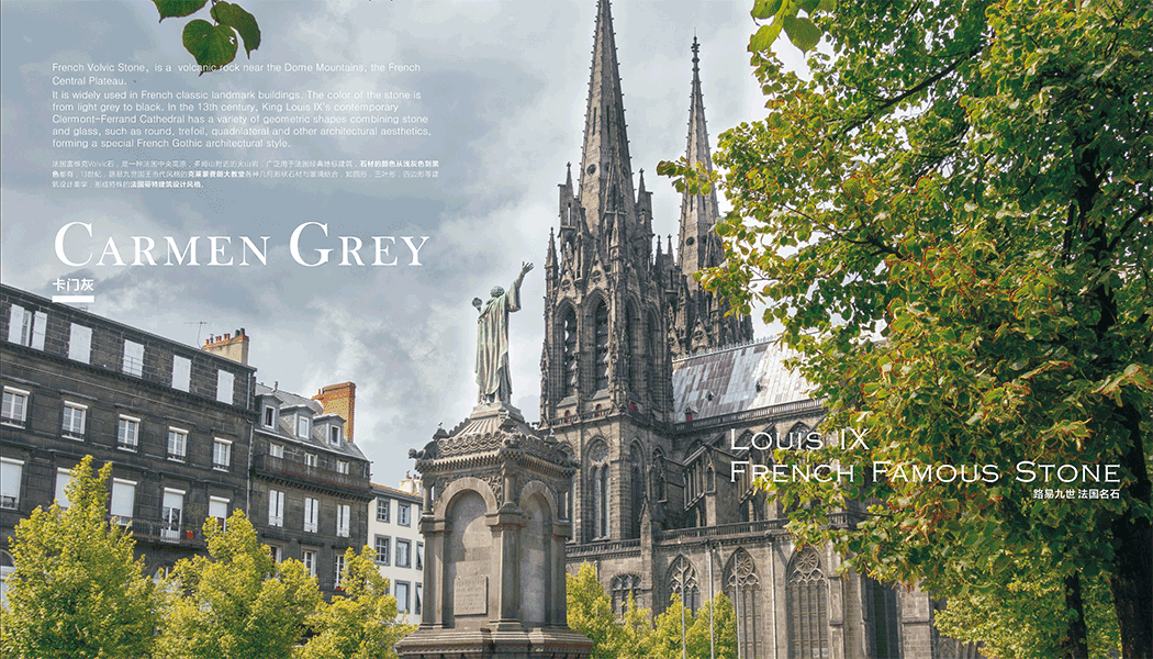 ,廣泛用于法國經典地標建筑,石材的顏色從淺灰色到黑色都有,13世紀,路易九世國王當代風格的克萊蒙費朗大教堂各種幾何形狀石材與玻璃結合,如圓形,三葉形,四邊形等建筑設計美學,形成特殊的法國哥特建筑設計風格。
